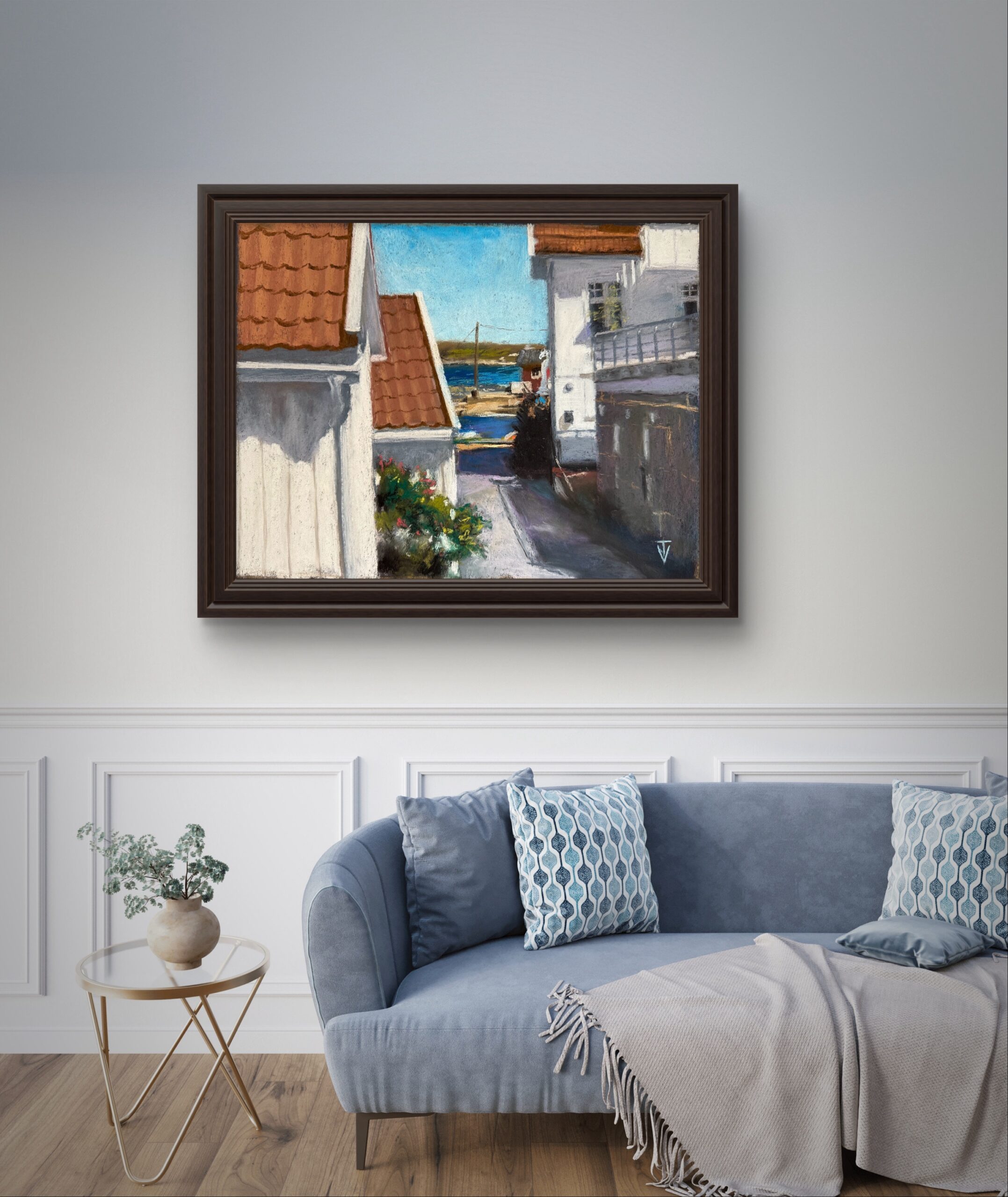 I denne stemningsfulle pastelltegningen har Tellus Vituz fanget et karakteristisk utsnitt fra kystbyen Nevlunghavn – et sted han kjenner godt og ofte vender tilbake til. Utsikten gjennom den smale passasjen mellom hvitmalte sørlandshus med rød takstein leder blikket ned mot havet, der lyset treffer bryggekanten og gir liv til det blå vannspeilet i bakgrunnen.