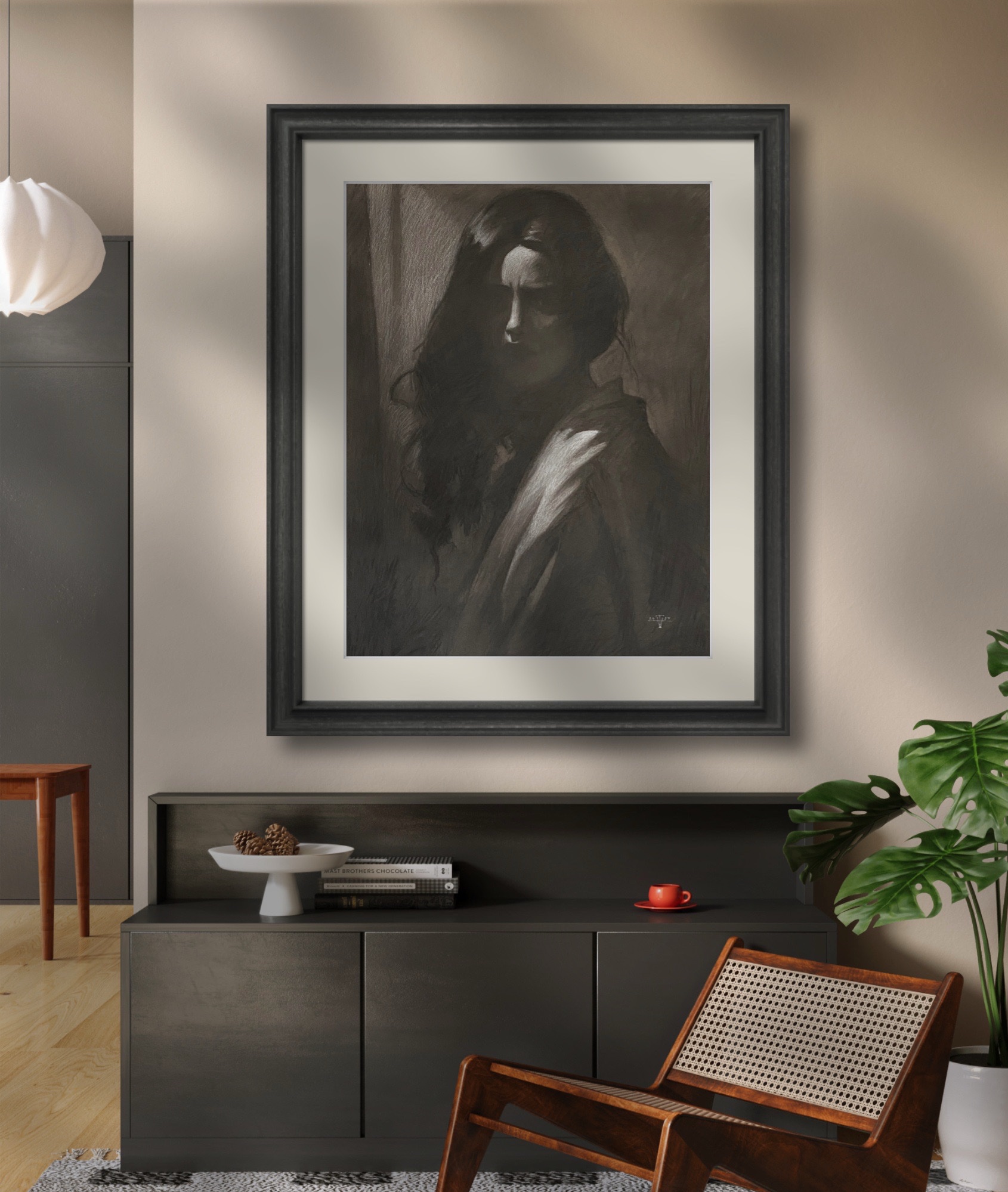 Denne kulltegningen er et uttrykksfullt portrett som utforsker den psykologiske dimensjonen av isolasjon og introspeksjon. Motivet viser en kvinne delvis skjult i skygger, hvor ansiktstrekkene kun delvis er synlige. Dette gir verket en gåtefull og dyster stemning, som inviterer betrakteren til å reflektere over de indre kampene og følelsene som ligger under overflaten.