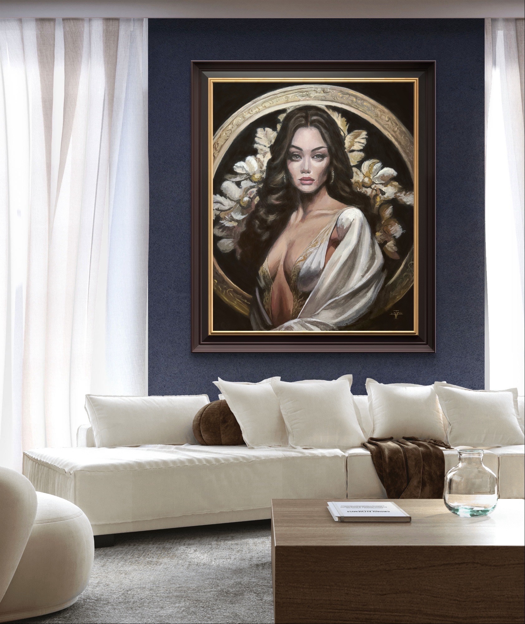 Jeg brukte varme og rike toner for å skape en følelse av luksus og eksklusivitet, der gullet i rammen symboliserer verdien vi tillegger slike ting i samfunnet vårt. Verket er en kommentar til hvordan vi idoliserer utseende, samtidig som vi legger mindre vekt på det som finnes under. Det er et moderne ikon – et symbol på vår tids overfladiske verdier.