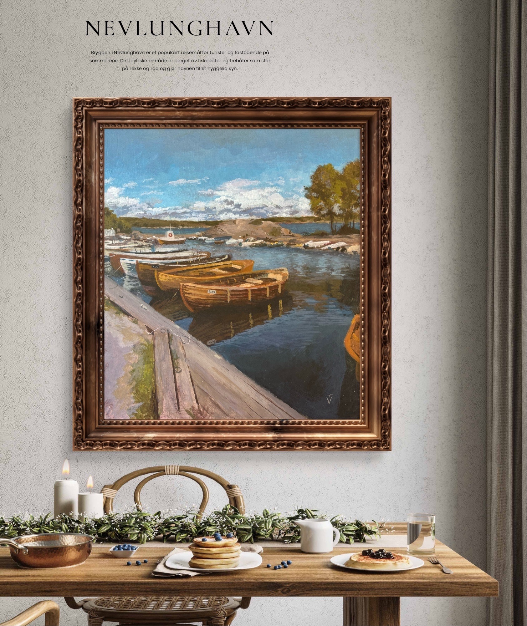 I dette maleriet har jeg ønsket å fange roen og stillheten ved vannkanten. Jeg valgte båtene som motiv, da de med sine varme, jordnære farger og myke linjer står i vakker kontrast til det dype blå vannet og den åpne, lyse himmelen. Refleksjonene i vannet gir en følelse av bevegelse, som om det er en mild bris som kruser overflaten. Bakgrunnen med svabergene og trærne skaper et rolig, naturlig landskap som omfavner båtene. Komposisjonen og lyssettingen gir dybde og atmosfære, og jeg ønsket at betrakteren skulle få en følelse av fred og nærvær – et øyeblikk hvor tiden nesten står stille. Tellus Vituz