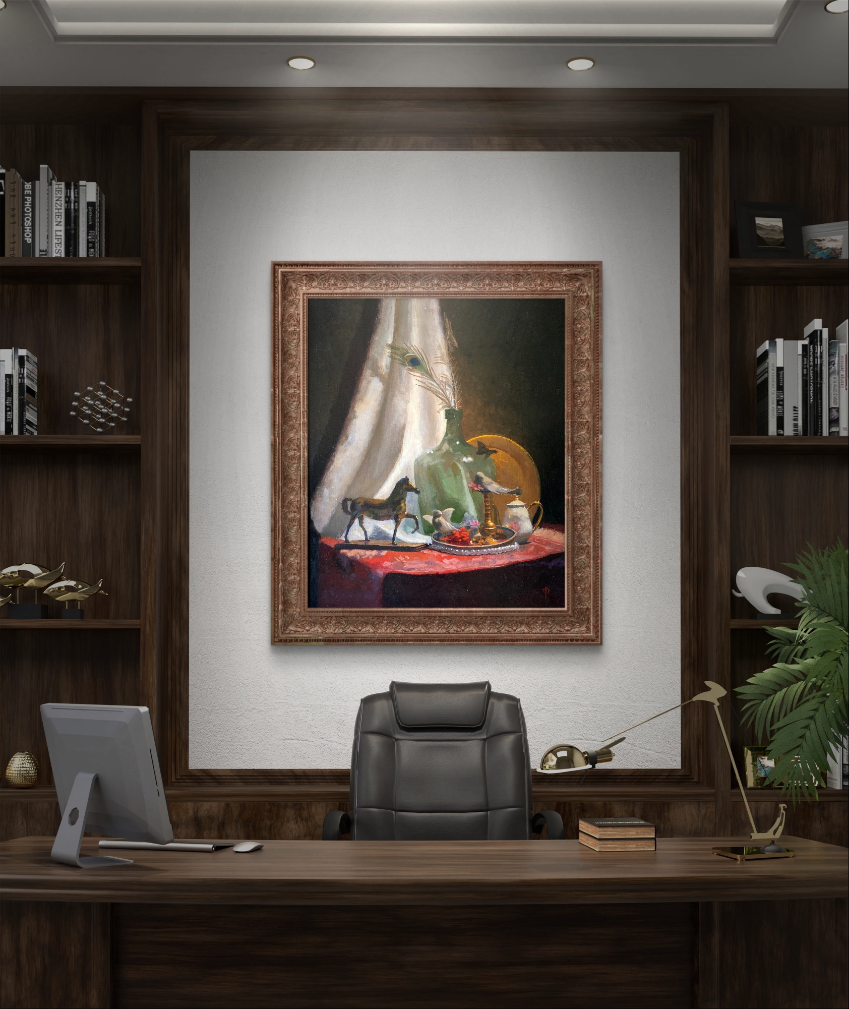 I dette stillebenmaleriet har jeg samlet en gruppe objekter som hver bærer sin egen historie og karakter. Den grønne glassflasken i sentrum, fylt med påfuglfjær, gir en følelse av eleganse og eksotisk skjønnhet. Til venstre står en liten hestefigur i metall, som symboliserer styrke og utholdenhet. Ved siden av flasken hviler små fugler på en gullfarget lysestake, som om de er i ferd med å ta til vingene. Den røde duken og den varme belysningen skaper en rik, dramatisk atmosfære, som gir hele komposisjonen en følelse av luksus og nostalgi. Jeg har valgt objekter og farger som spiller sammen for å skape en harmonisk balanse mellom lys og skygge, noe som gir betrakteren en følelse av tidløshet og ro i betraktningen av hverdagslige gjenstander som blir løftet frem og får ny betydning. Tellus Vituz