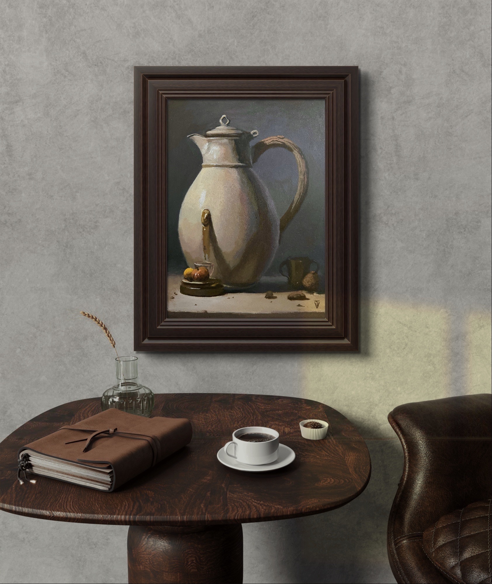 I dette maleriet har jeg valgt en gammel tekanne som hovedmotiv, omgitt av enkle objekter som fremhever dens klassiske form og patina. Tekannens varme, kremaktige nyanser spiller mot det kjølige, dempede bakgrunnslyset, og gir en følelse av ro og tyngde. Jeg har lagt vekt på hvordan lyset faller og brytes langs tekannekroppen, fremhever dens volum og skaper en subtil glød i metallet. De små fruktene og den rustikke koppen på siden gir balanse til komposisjonen og tilfører litt farge og tekstur, samtidig som de understreker tekannekroppens ruvende stillhet. Gjennom dette maleriet ønsket jeg å utforske det tidløse ved hverdagslige objekter, hvordan de kan romme minner og historier og tiltrekke seg betrakterens blikk med sin enkle skjønnhet. Tellus Vituz