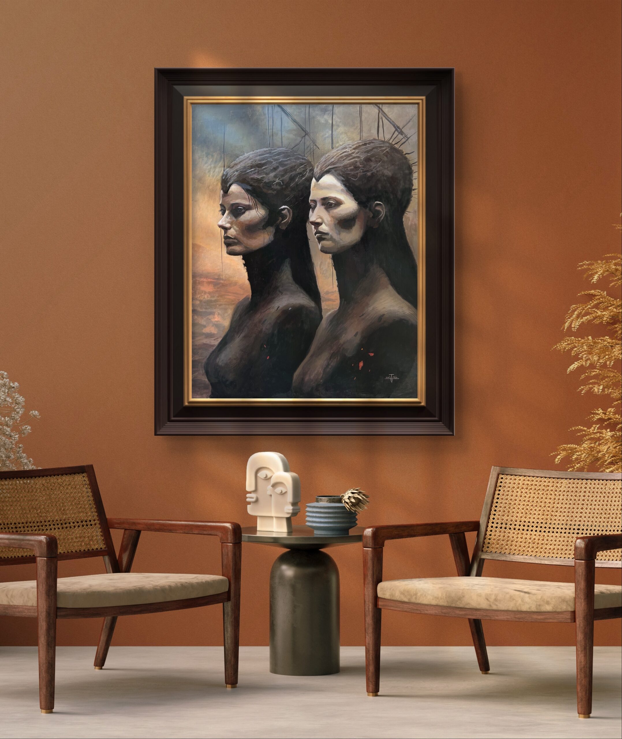 I motivet «Svikere» ønsket jeg å fange en dyp følelse av svik og melankoli. De dempede og mørke tonene forsterker den tungsindige stemningen og formidler en opplevelse av håpløshet og forræderi. De to figurene, gjengitt i jordnære nyanser av brunt og svart, står side om side med alvorlige og fjerne uttrykk.