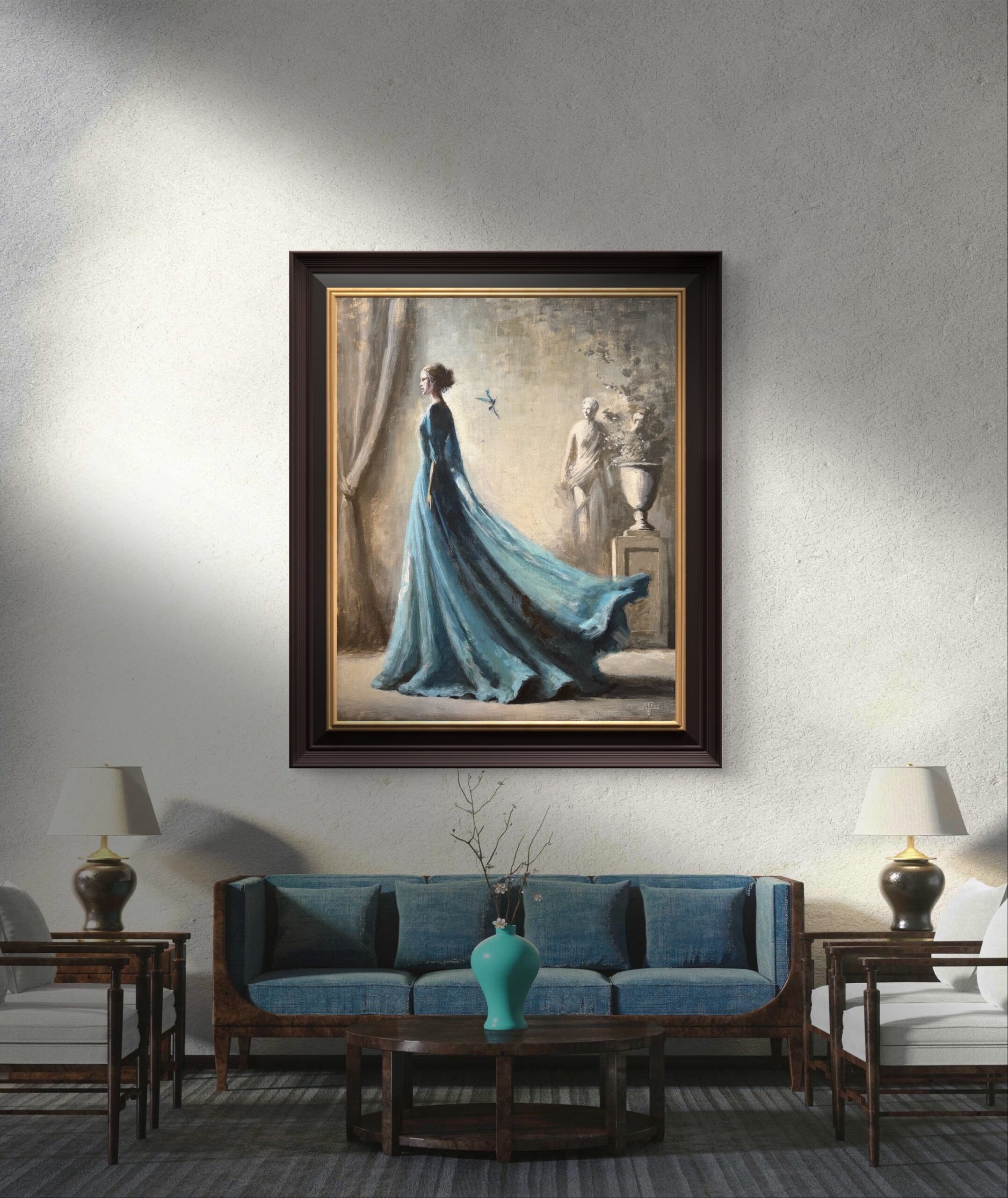 Dette verket utforsker følelsen av ensomhet gjennom et minimalistisk uttrykk. Med en dempet palett og tomme omgivelser ønsket jeg å skape en scene som gjenspeiler indre stillhet og melankoli. Den kvinnelige figuren, kledd i en blå kjole, står alene i et rom uten varme og nærvær – hennes plassering understreker en følelse av isolasjon.