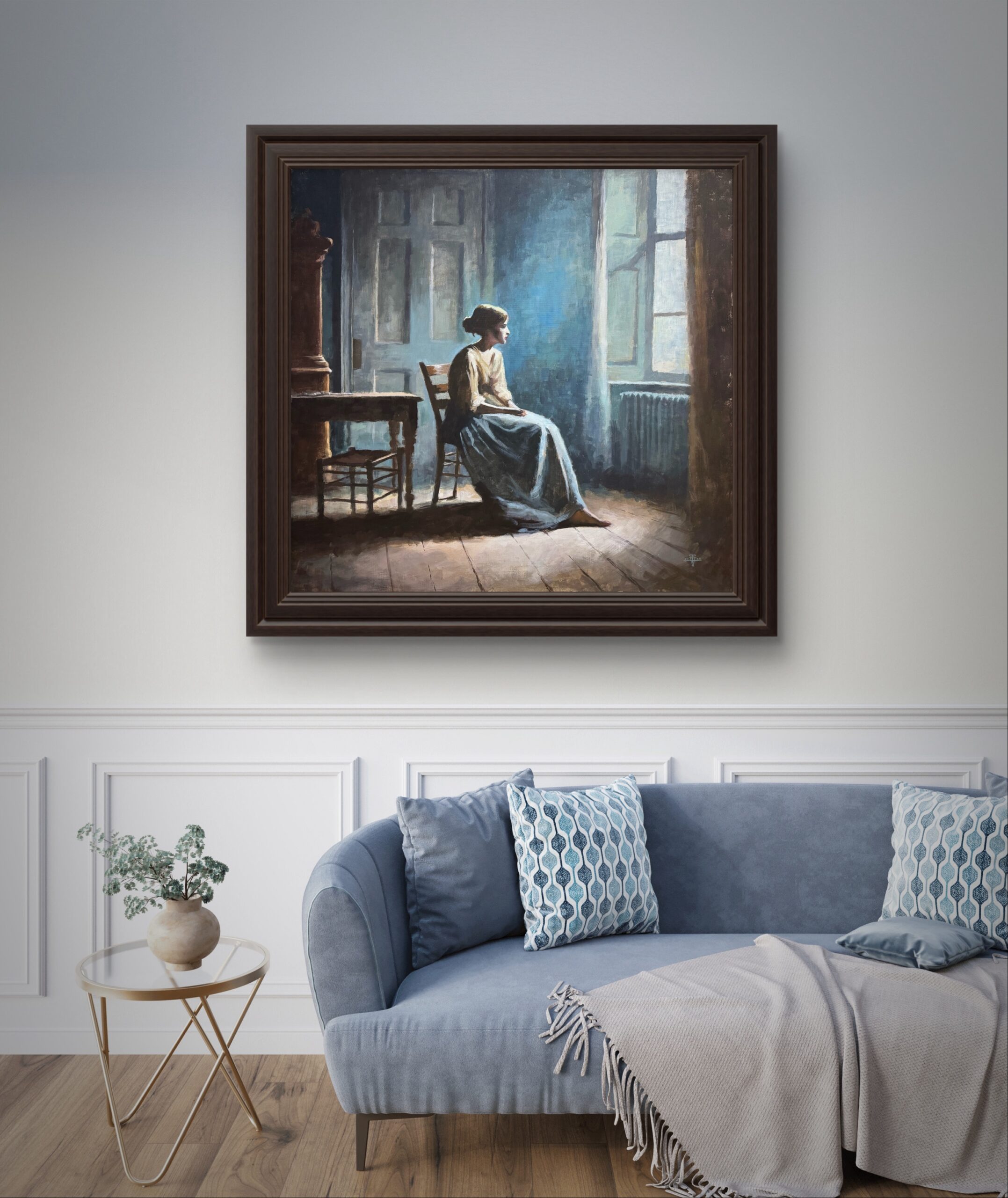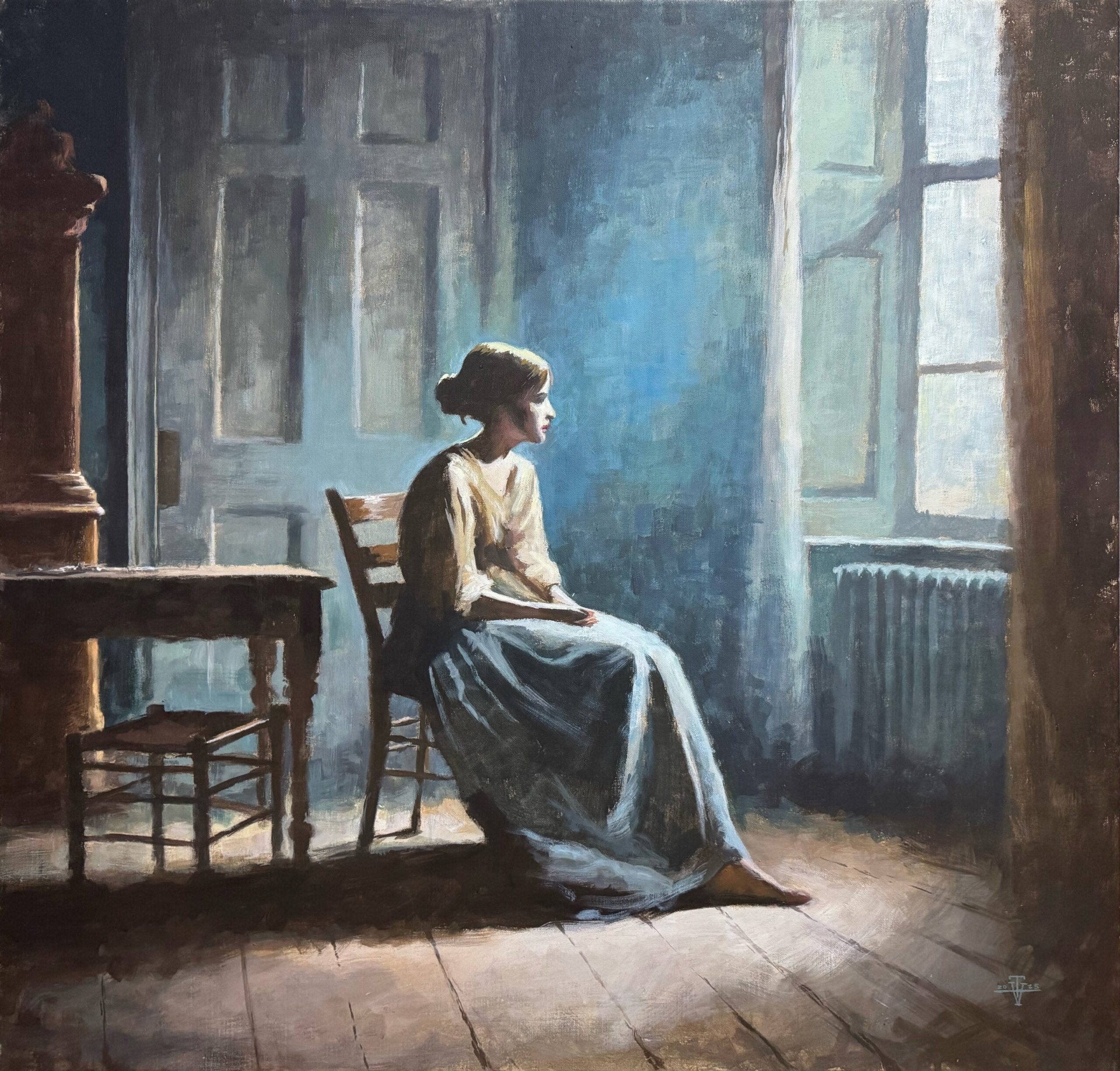 I dette motivet skildrer Tellus Vituz en enslig kvinne som sitter i et svakt opplyst rom, badet i mykt dagslys. Hun ser mot vinduet, der lyset strømmer inn og antyder en verden full av liv utenfor hennes isolerte tilværelse. Det sparsomt møblerte rommet, med sine kjølige blåtoner, står i kontrast til varmen fra lyset utenfor.