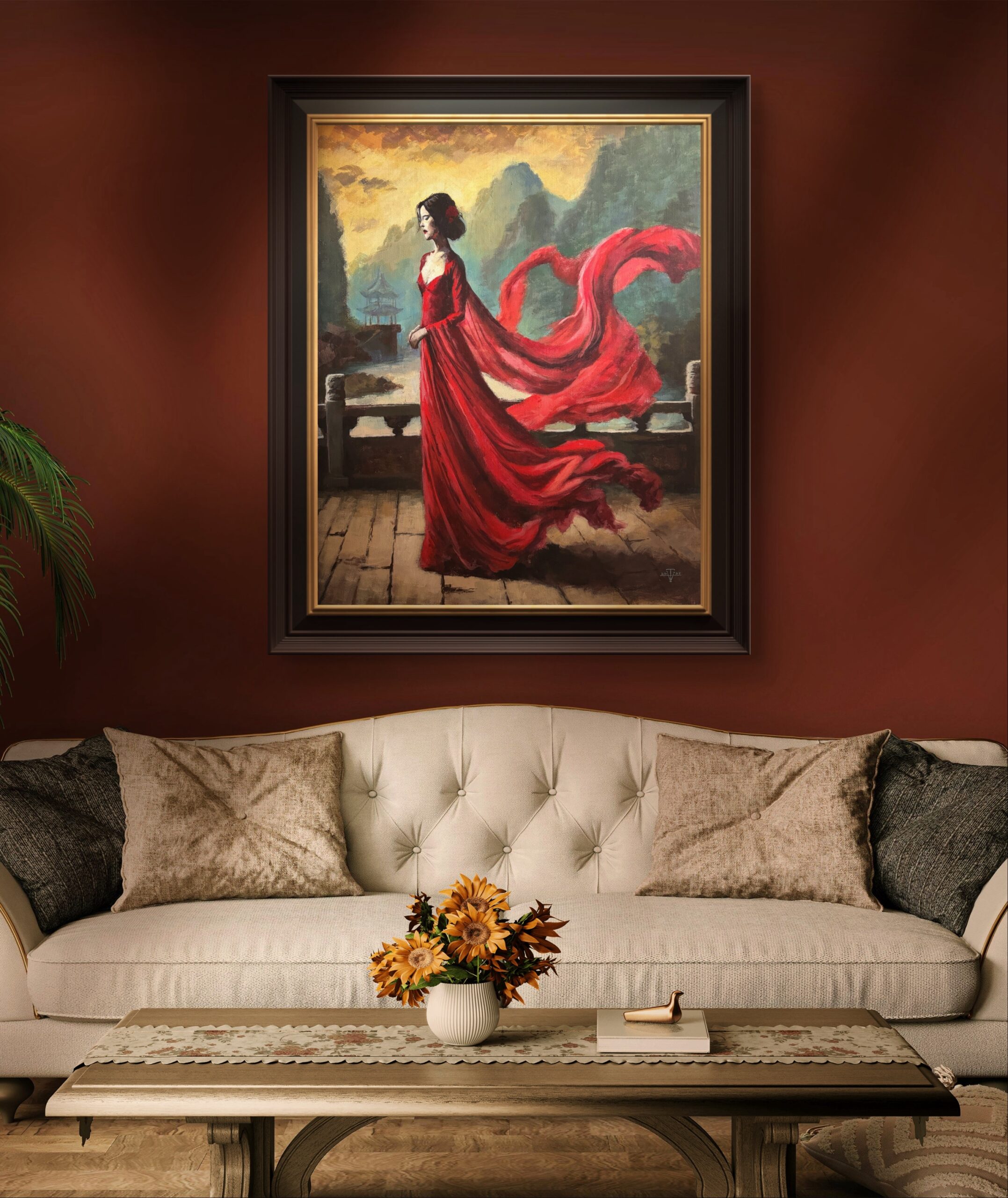 Farger spiller en sentral rolle – den røde kjolen symboliserer lidenskap, styrke og vitalitet, mens de dempede grønne og gyldne nyansene i landskapet gir en rolig motvekt. Maleriet formidler både indre ro og ustyrlig energi, og plasserer kvinnen i hjertet av en usynlig symfoni spilt av vinden.